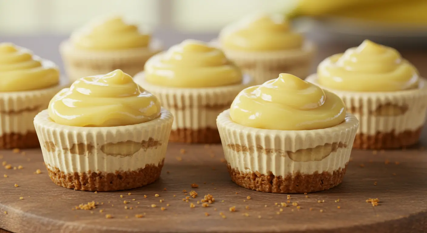 Top each mini cheesecake with a swirl of whipped cream, a banana slice, and crushed vanilla wafers just before serving. This makes them look bakery-worthy and adds even more banana pudding vibes.