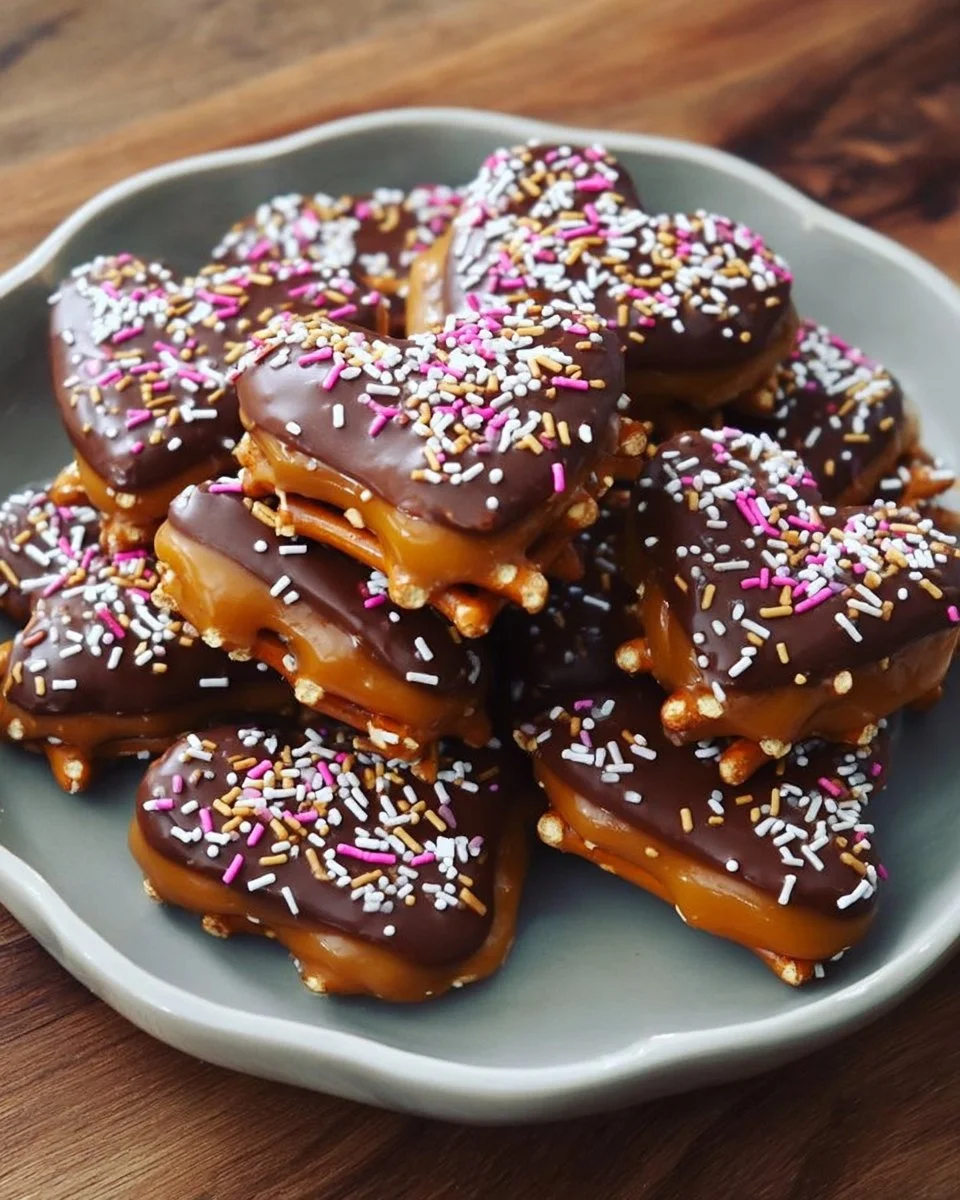 These little rounds pack a lot of personality: crunchy pretzel, buttery caramel, and silky chocolate with a sprinkle of festive hearts — each bite is a tiny story. They’re playful and fuss-free, perfect for gifting, sharing, or sneaking one when no one’s looking. The aroma while they set — warm caramel and rich chocolate — will fill your kitchen with instant comfort and make anyone nearby a willing taste-tester.